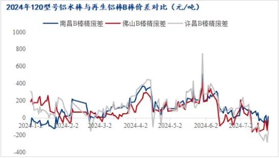 隨著鋁價的大幅回落,鋁水棒加工費也逐步回歸至往年中高位置。而再生鋁棒受廢鋁原材料高企制約,加上鋁價持續(xù)回落,企業(yè)長期處于虧損狀態(tài),再生鋁棒價格相比鋁水棒價格表現(xiàn)更加堅挺。就B棒而言,目前周均結算加工費在200-400元/噸,點價結算加工費在350-550元/噸,價格已趕超原生棒價格。7月份B棒精廢差在-300~100元/噸區(qū)間震蕩盤整,且長期處于負值,精廢差倒掛。在高生產成本下,企業(yè)不得不集體挺價保利接單,下游對目前價格接受度有限,多采購原生棒居多,再生鋁棒市場需求遇冷。