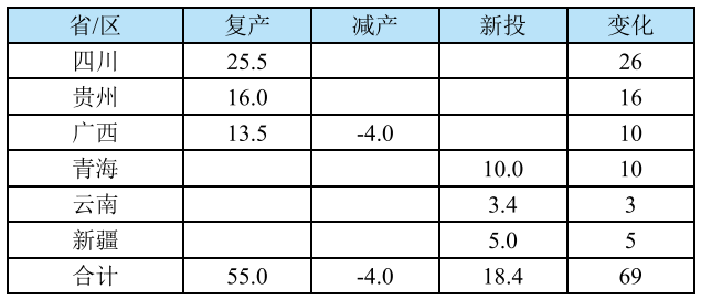 2025年復(fù)產(chǎn)產(chǎn)能55萬(wàn)噸/年,主要分布在四川、貴州和廣西等省/區(qū),復(fù)產(chǎn)產(chǎn)能大部分來(lái)自2024年底由于經(jīng)營(yíng)壓力過(guò)大而關(guān)停的企業(yè),還有一部分來(lái)自于技改后投放的項(xiàng)目。