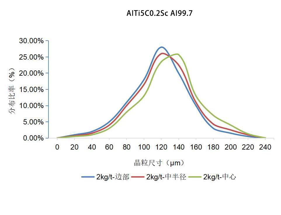 鋁鈦碳鈧遺傳了鋁鈦碳的優(yōu)良性能,在實(shí)際生產(chǎn)應(yīng)用中,鋁鈦碳鈧能夠顯著減小鑄件邊緣和芯部的晶粒尺寸差距,使得鑄件的整體組織結(jié)構(gòu)更加均勻一致,從而有效改善了鑄件的力學(xué)性能與加工性能。