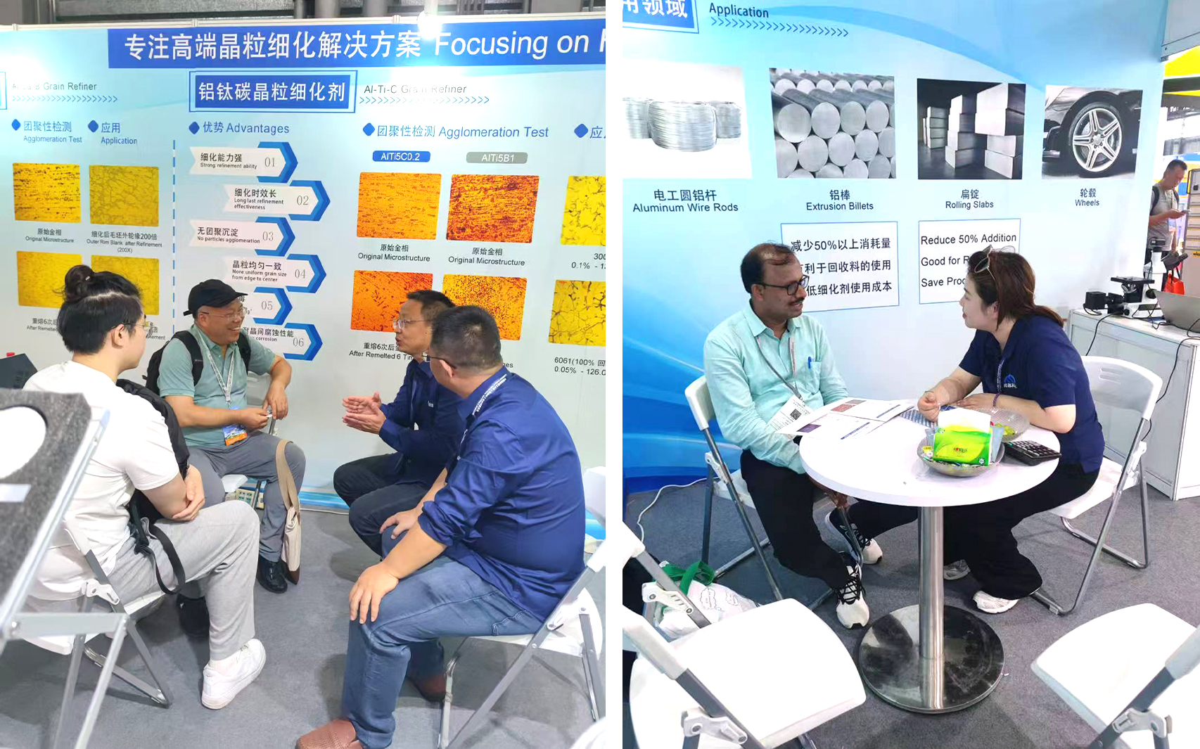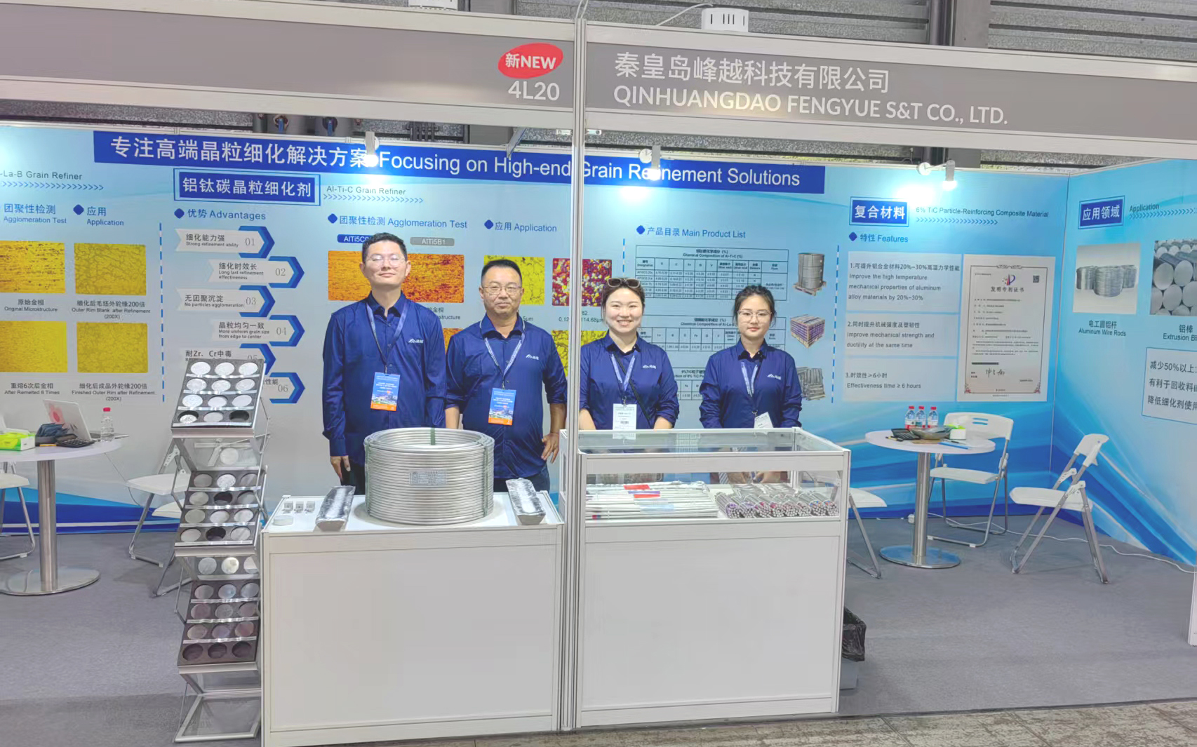 峰越科技此次重點展示了自主研發(fā)的鋁鑭硼(AlLa3B1.5)晶粒細(xì)化劑、6% TiC 顆粒增強復(fù)合材料和鋁鈦碳鈧(AlTi5C0.2Sc)晶粒細(xì)化劑。